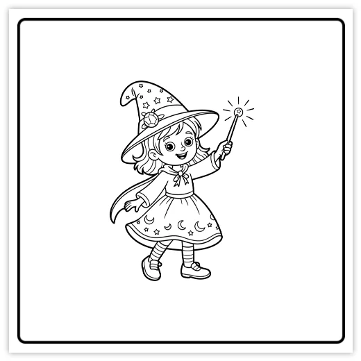 This pumpkin is ready to cast a spell with its hat and magic wand. Its costume is complete with a bow tie and shoes. Trees with hearts, as well as the pumpkin’s house, can be seen in the background. Use a bit of magic yourself to add color to this funny page.